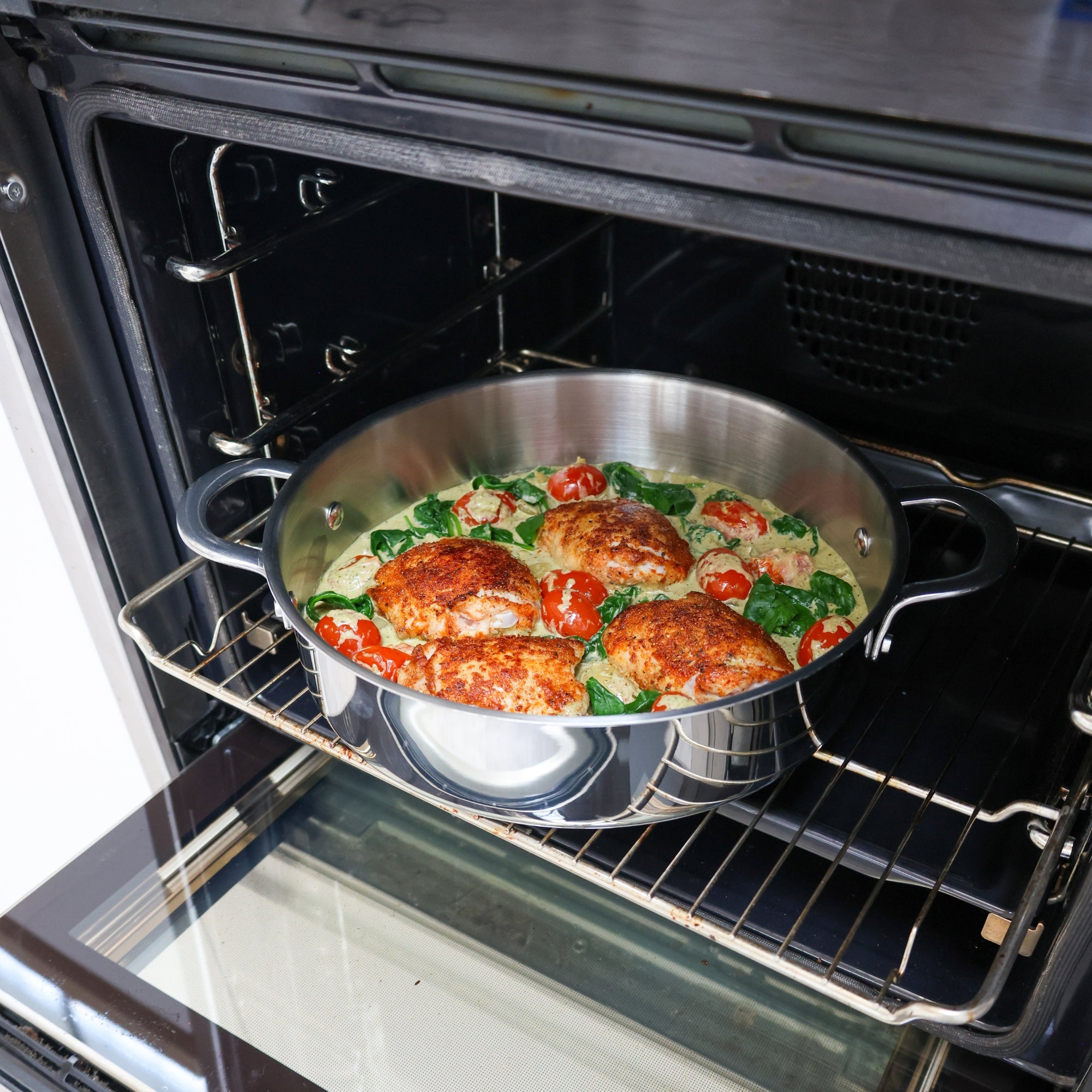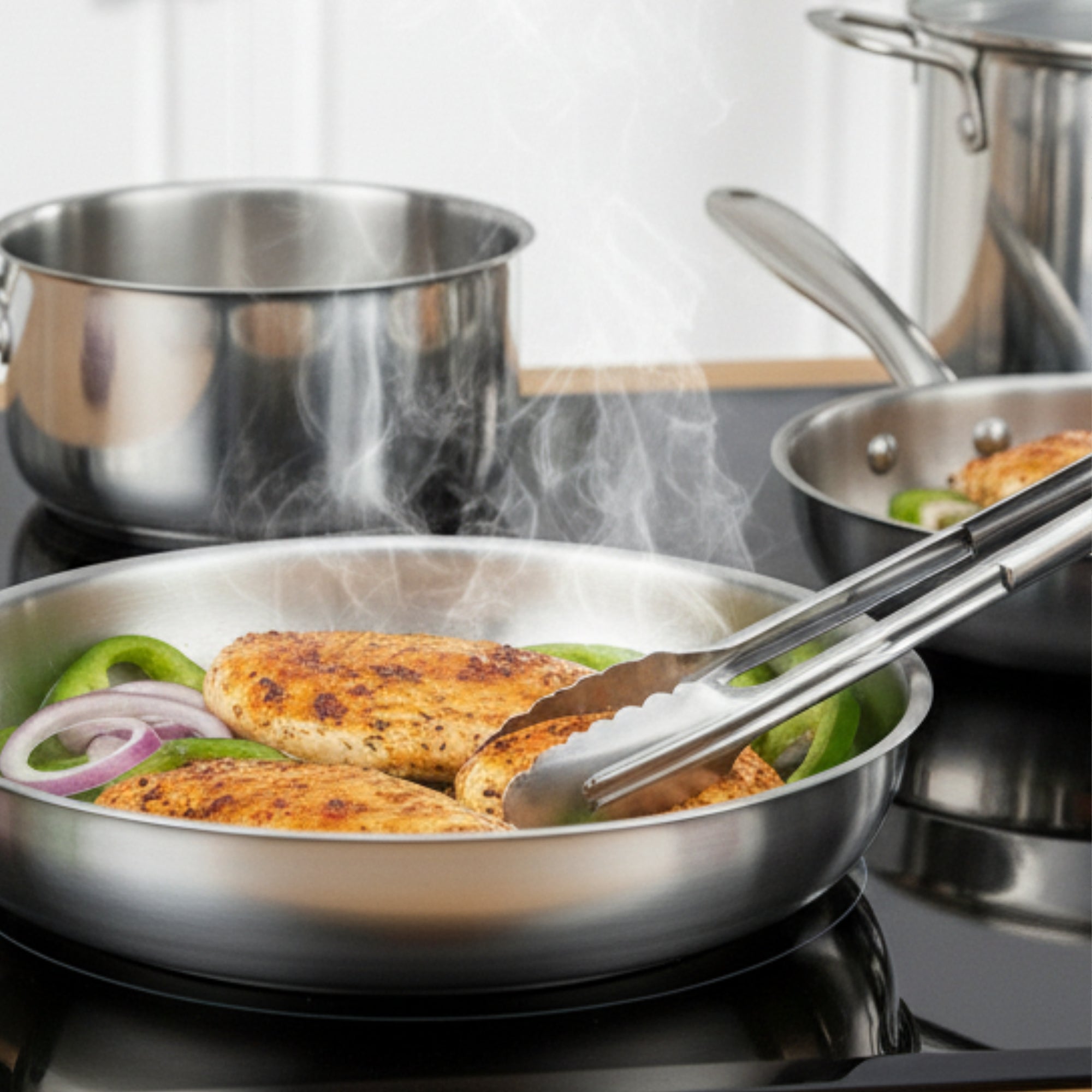 One of the biggest advantages of cooking with stainless steel is the ability to sear meat and vegetables on high heat and to create golden colour and that add a beautiful crisp finish.