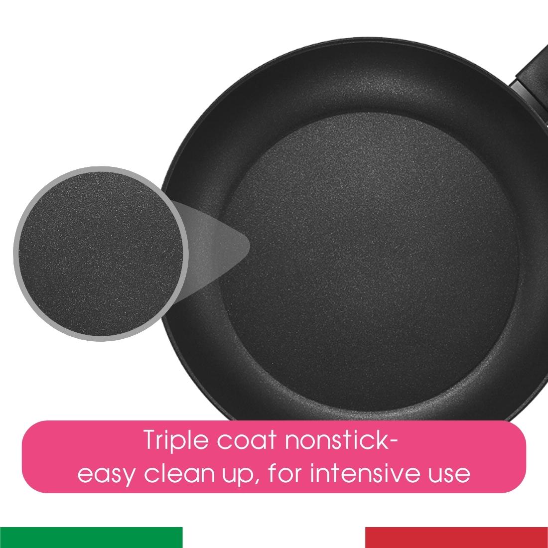 - Triple Layer PFOA Free Nonstick Interior reinforced with hard mineral particles for intensive daily use and even heat distribution